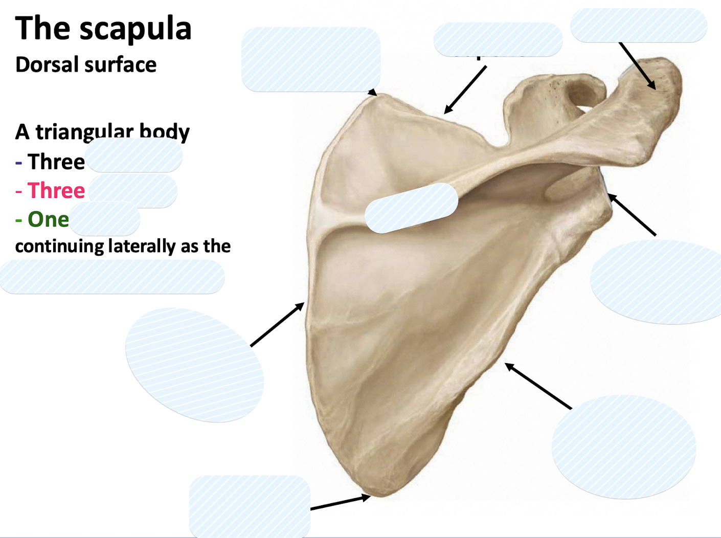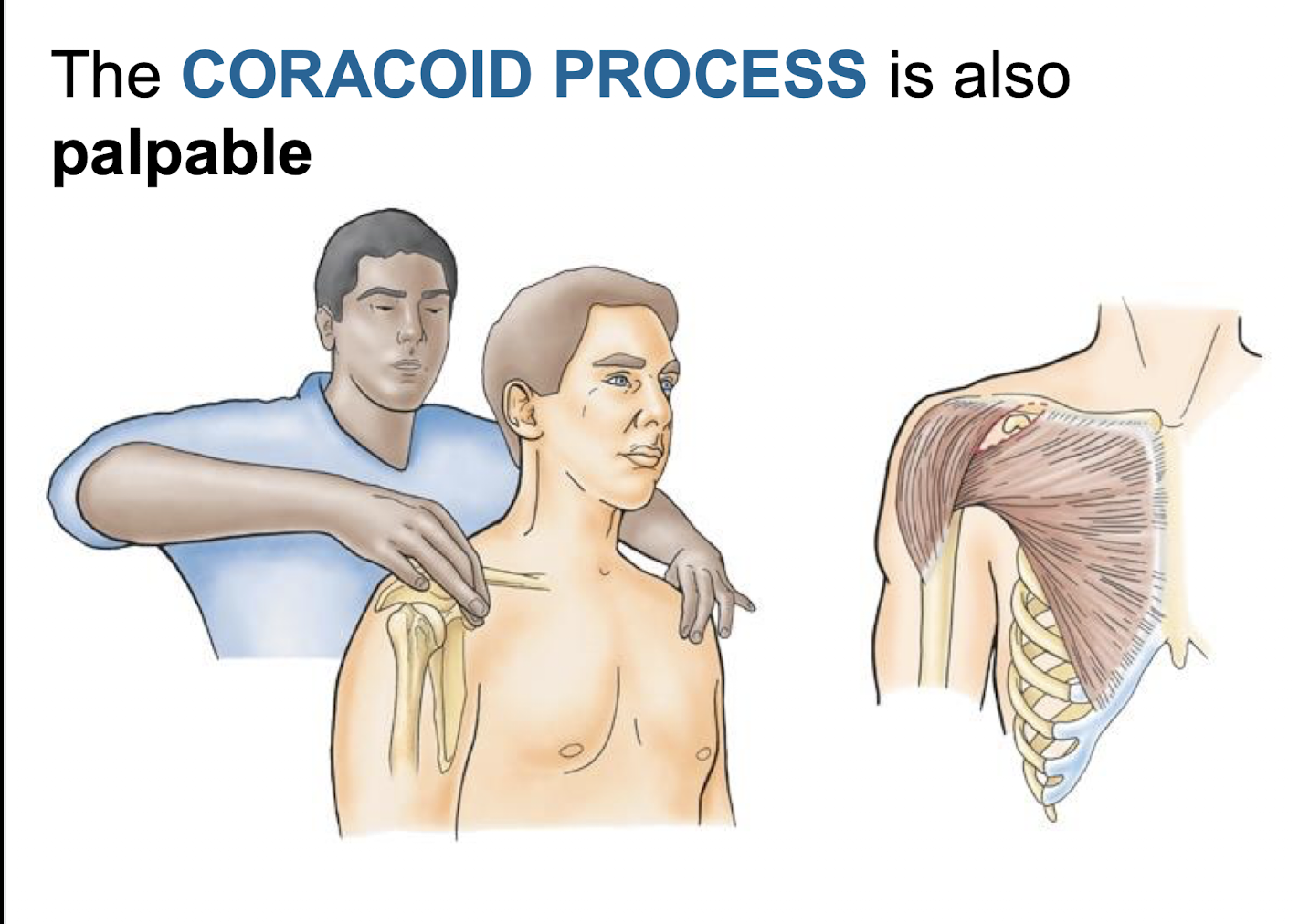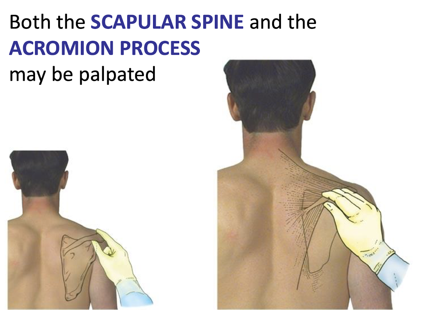 The scapular spine, acromion process, and coracoid process are all palpable.