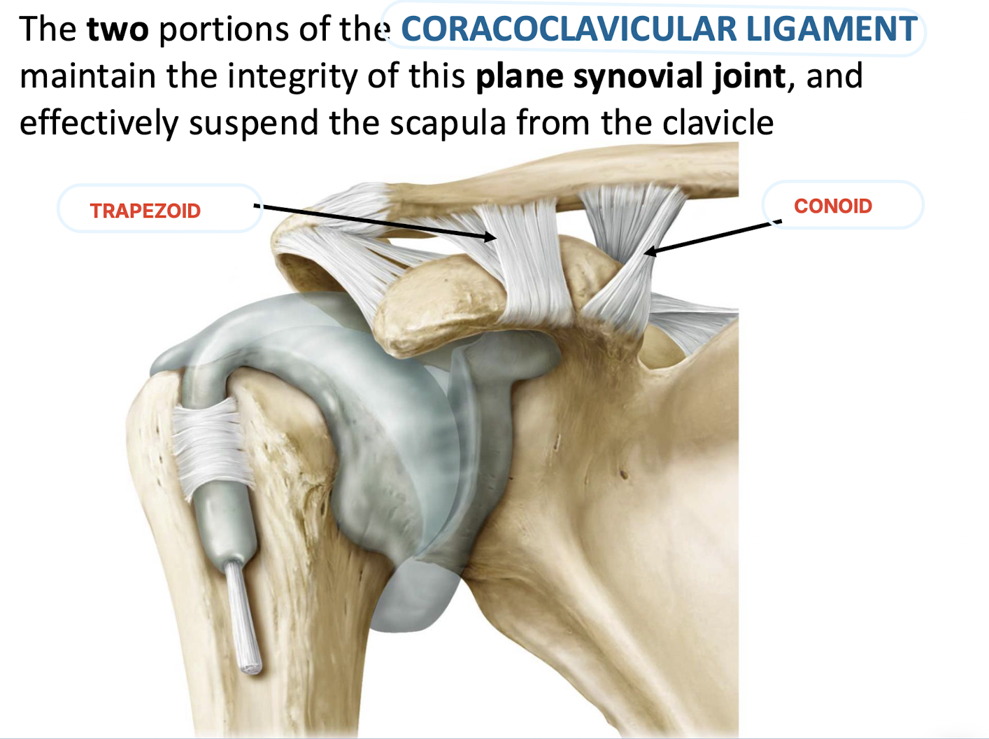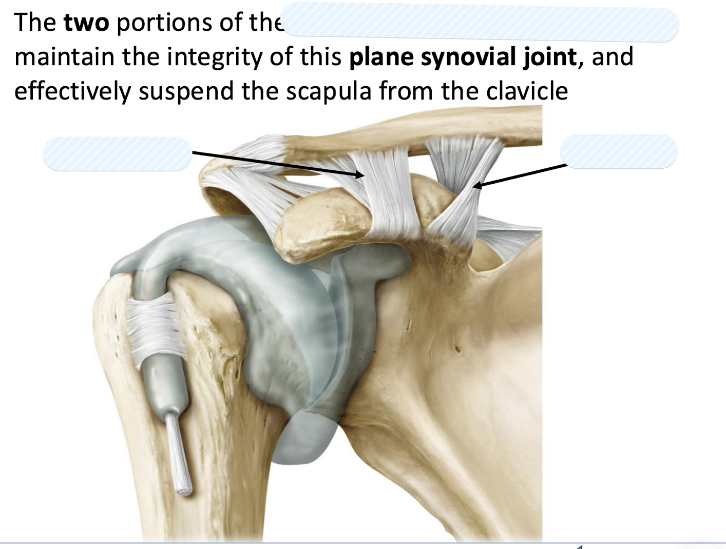 Which ligament maintains the integrity of the AC joint and effectively suspends the scapula from the clavicle?
