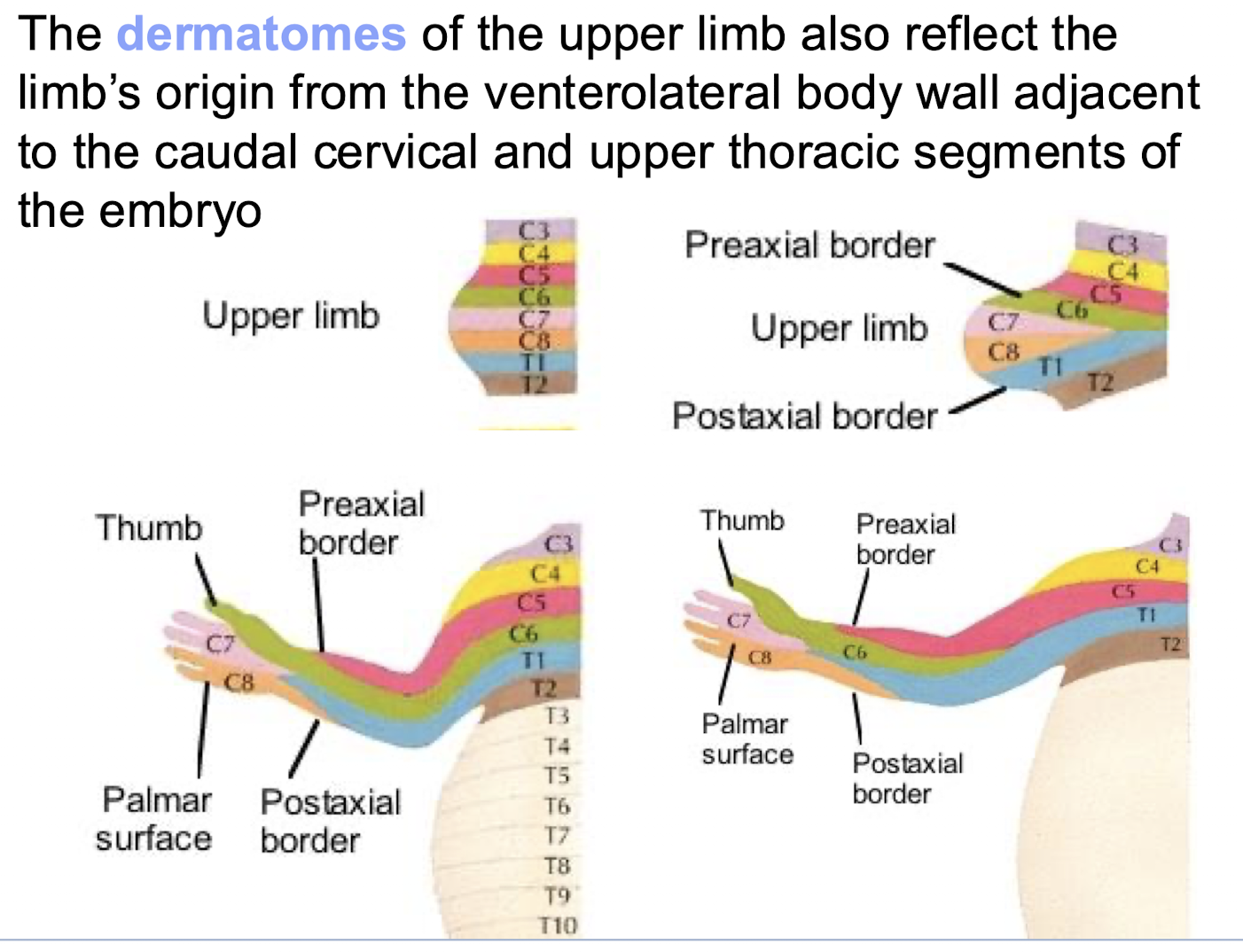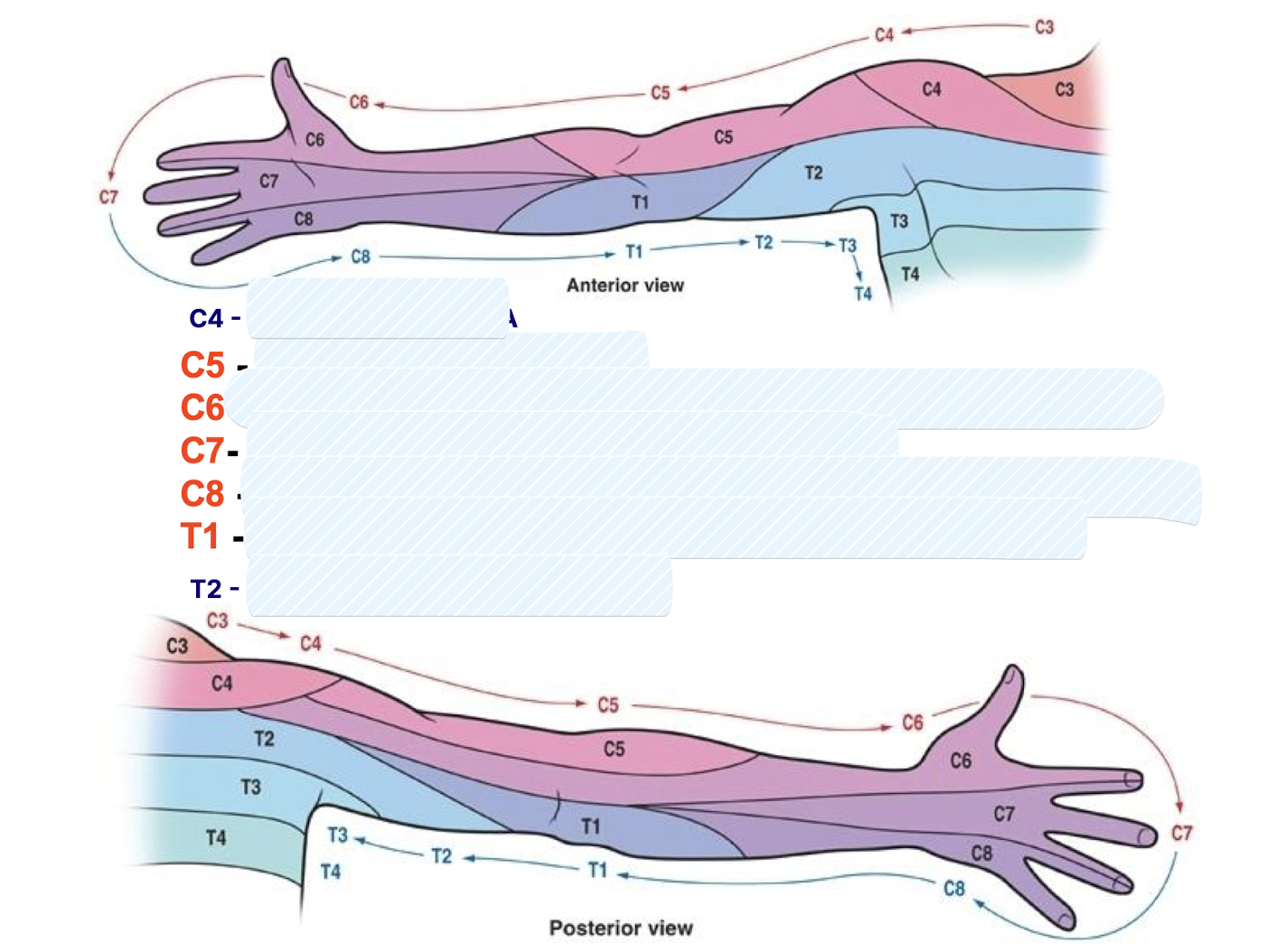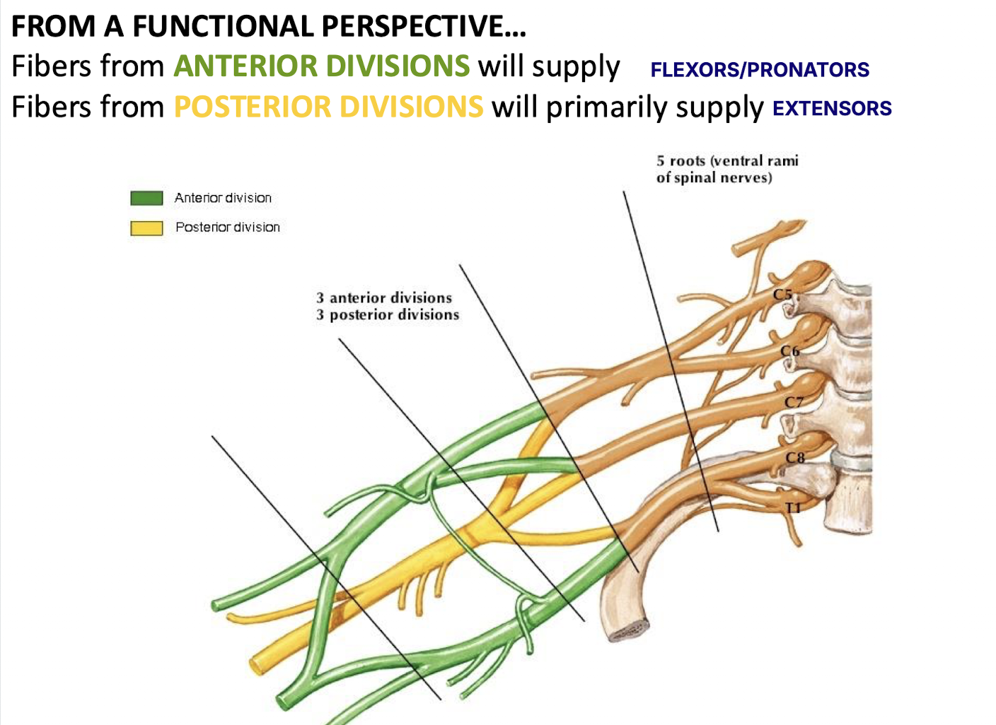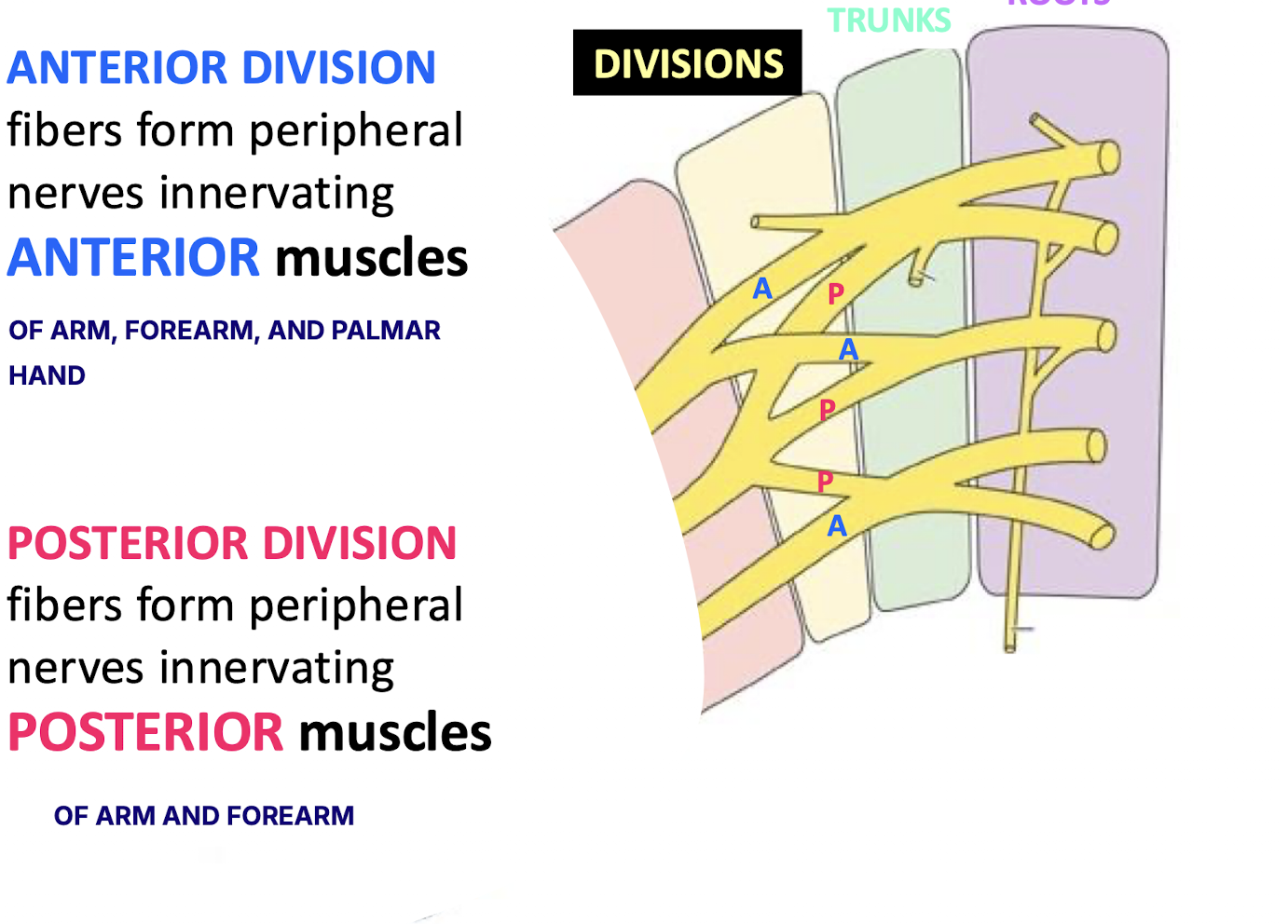 Anterior supply flexor/pronator muscles (ARM, FOREARM, AND PALMAR HAND); Posterior supply extensor muscles (ARM AND FOREARM).