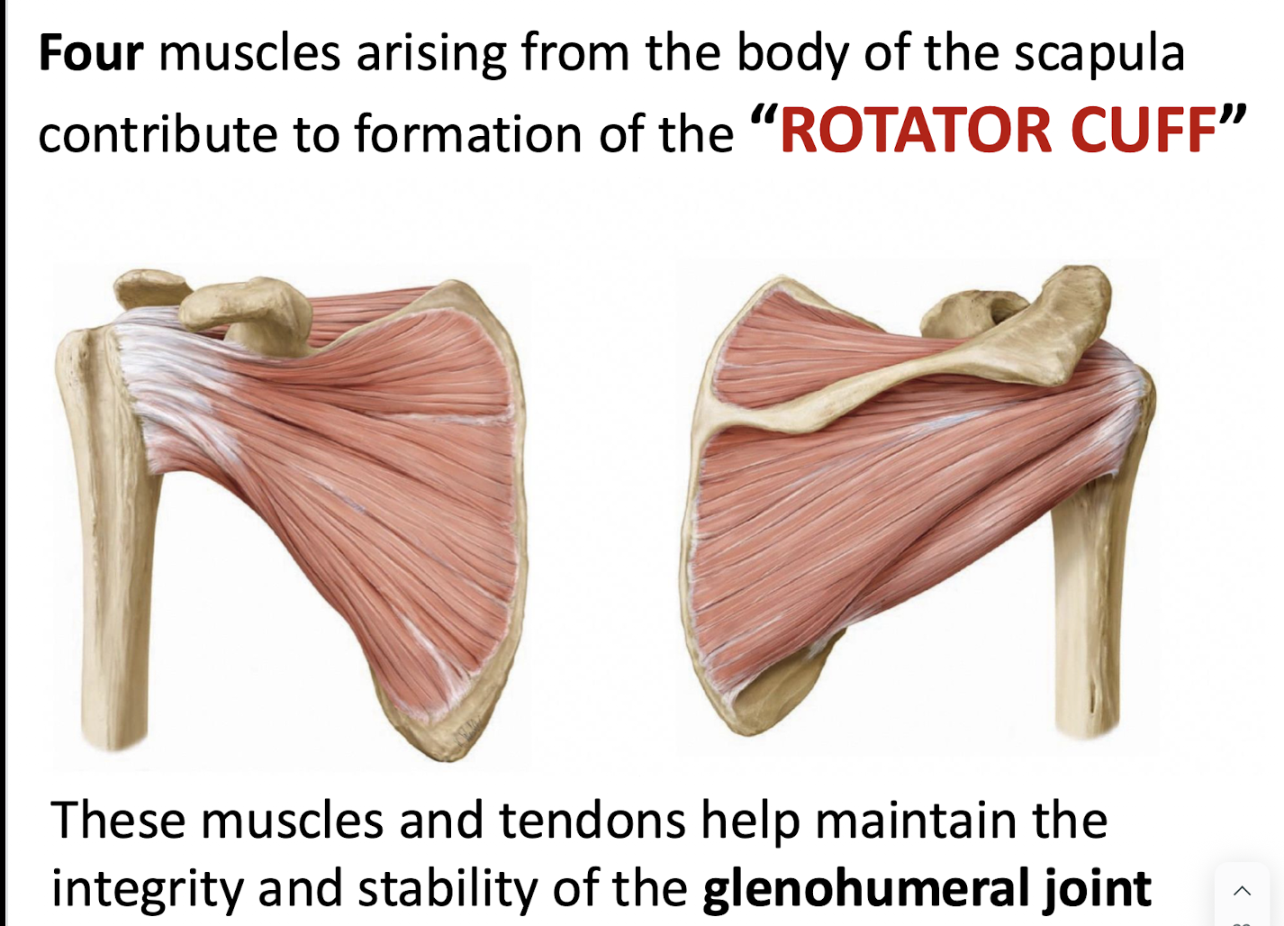 They help maintain the integrity of the glenohumeral joint and stabilise it during contraction of powerful thoracoappendicular muscles.