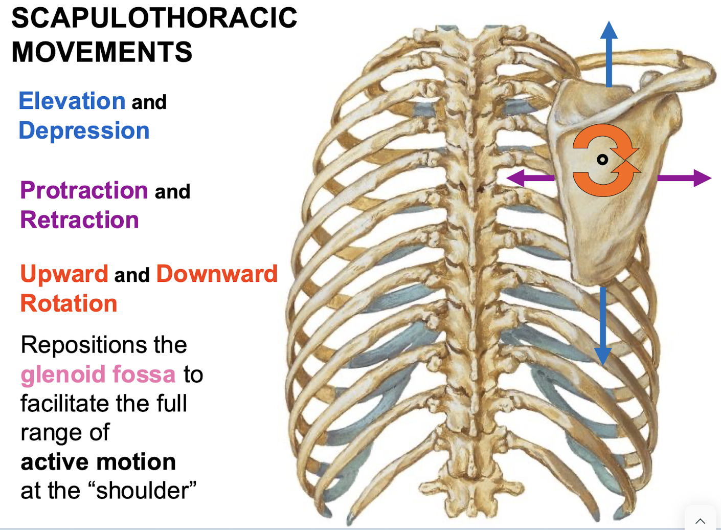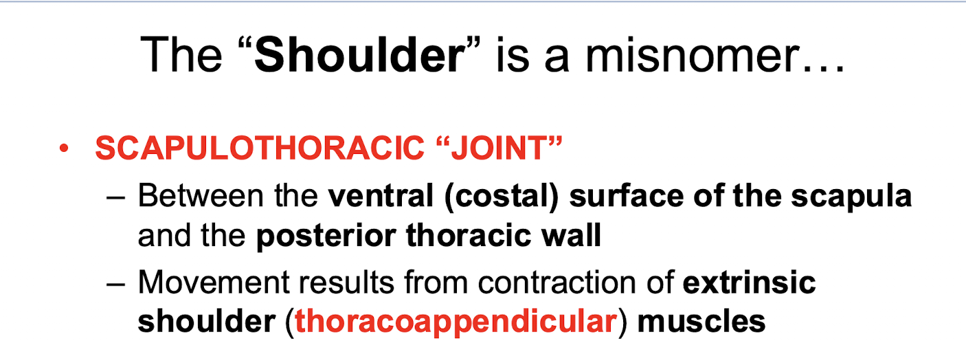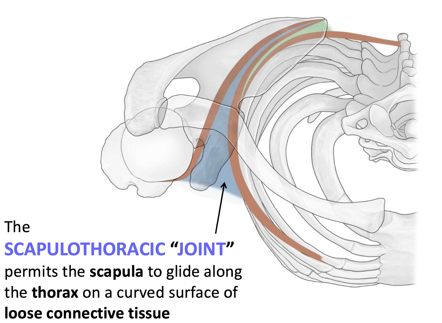 The SCAPULOTHORACIC “JOINT” permits the scapula to glide along the thorax on a curved surface of loose connective tissue