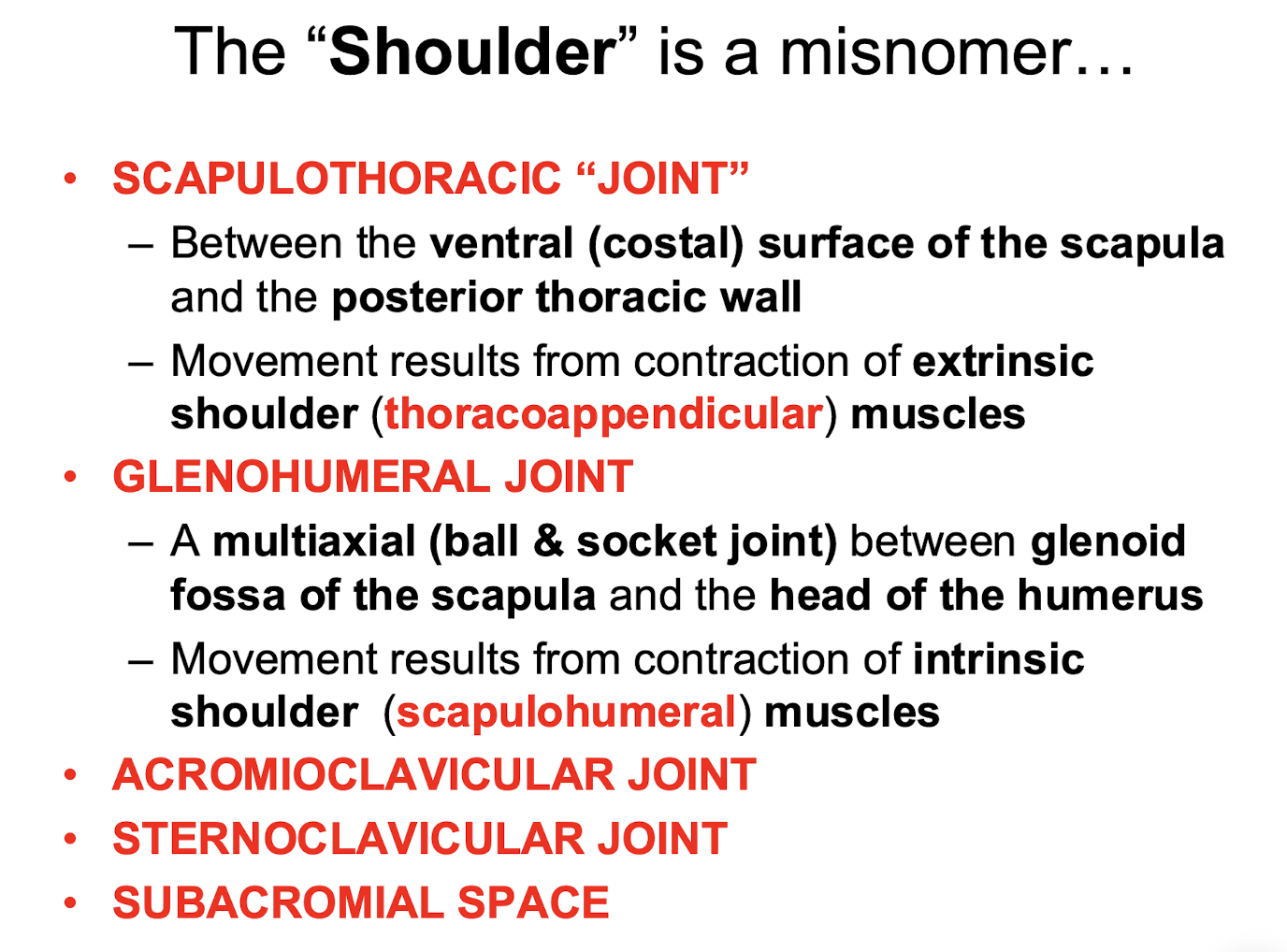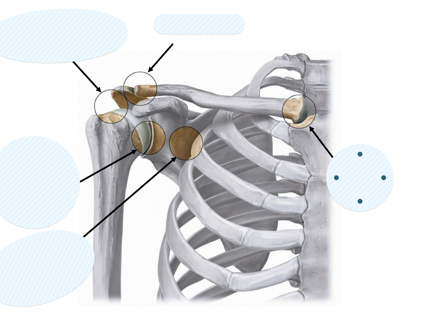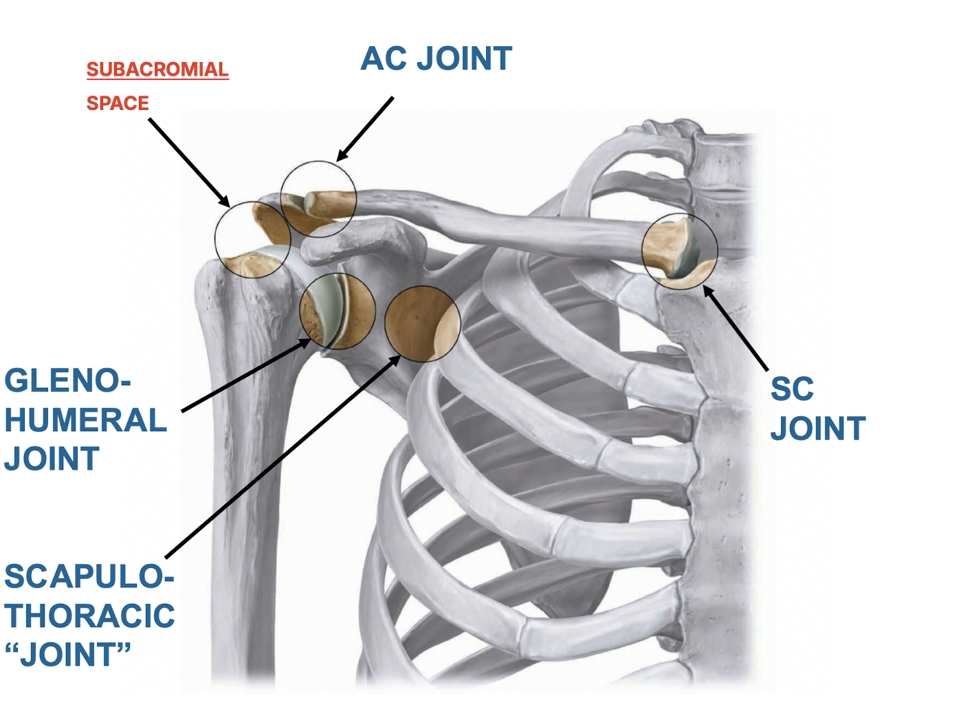 The sternoclavicular (SC) joint, acromioclavicular (AC) joint, glenohumeral joint, and scapulothoracic "joint".