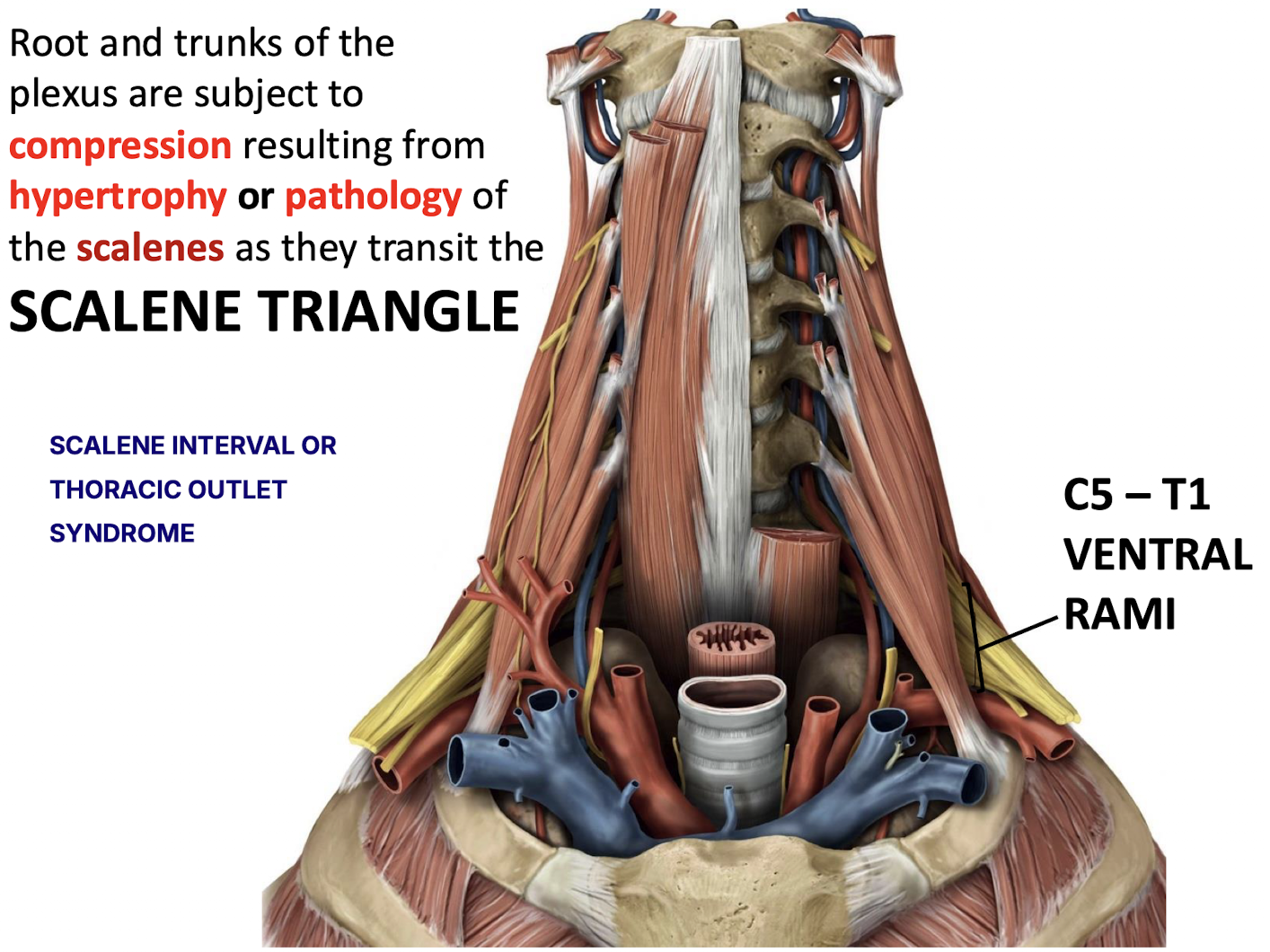 Compression occurs in the scalene triangle (scalene interval) as the C5–T1 ventral rami pass through.