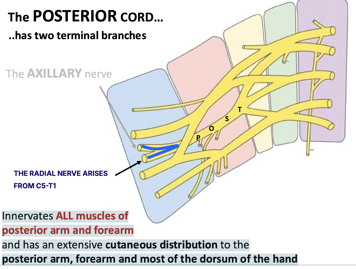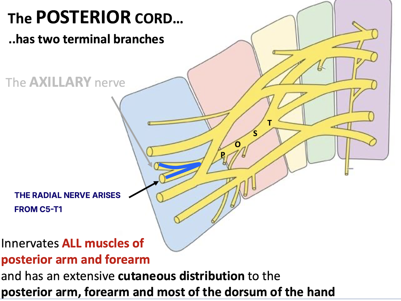Innervates ALL muscles of posterior arm and forearm and has an extensive cutaneous distribution to the posterior arm, forearm and most of the dorsum of the hand