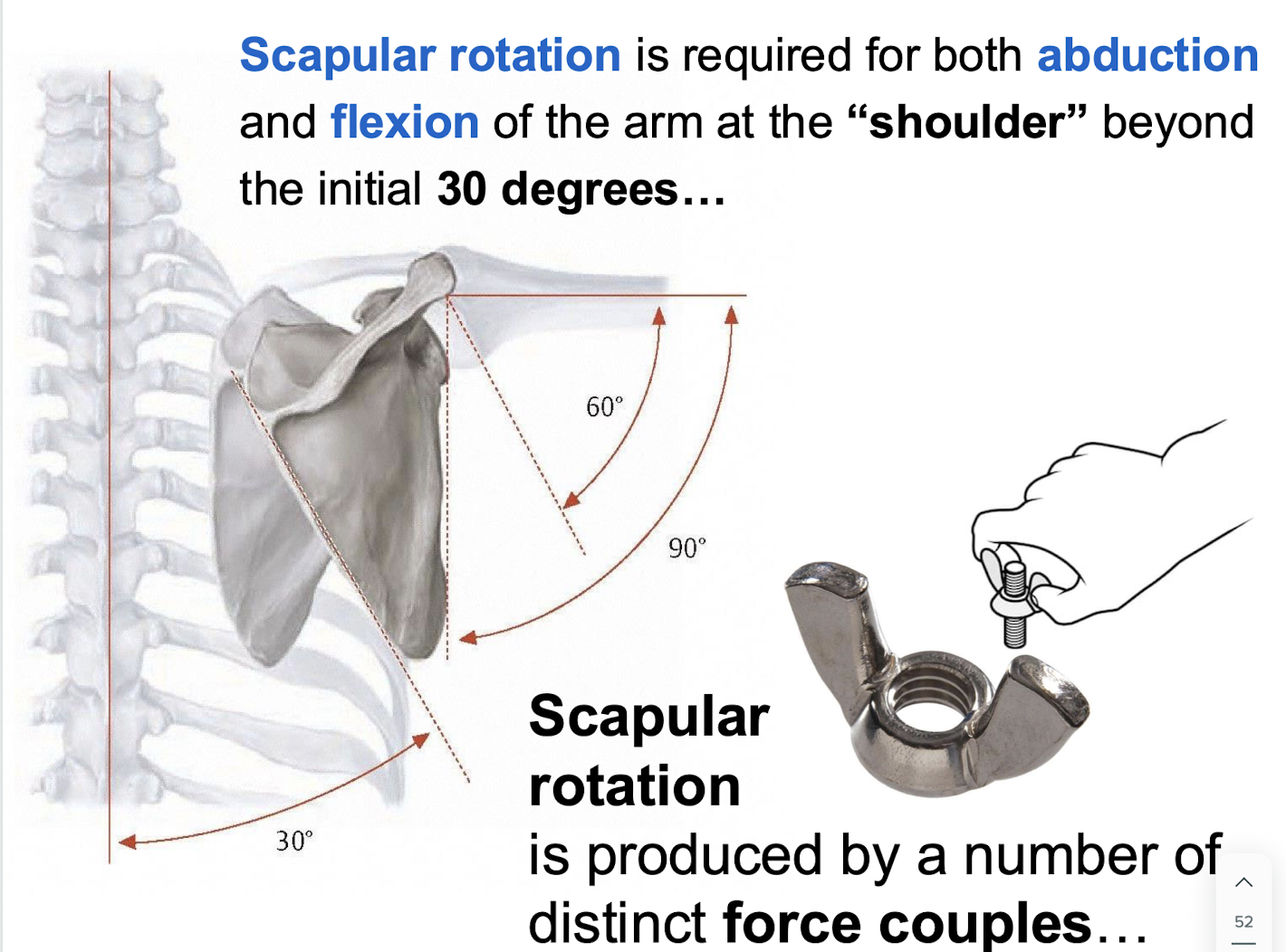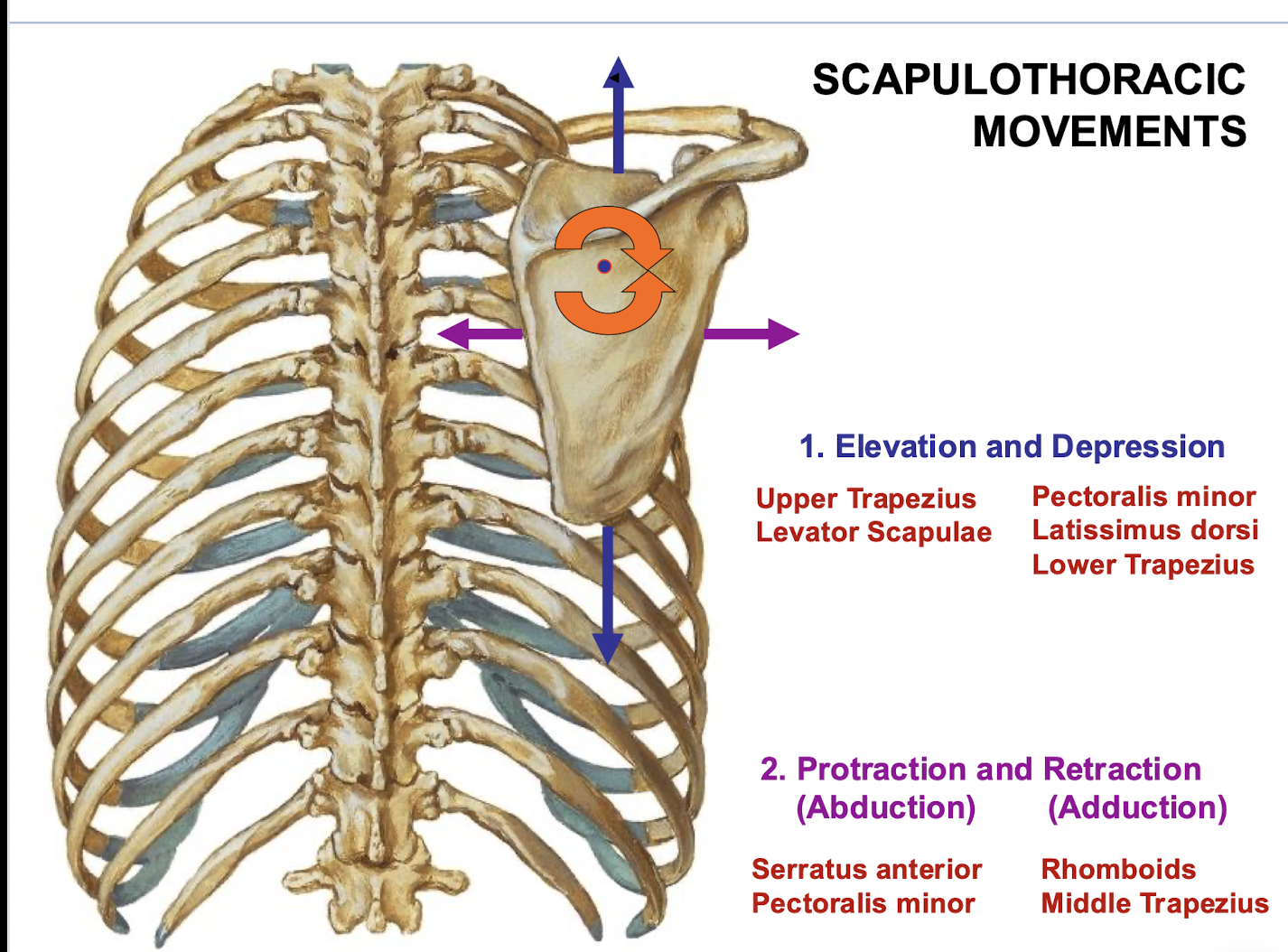 Elevation/depression, protraction/retraction, and upward/downward rotation.