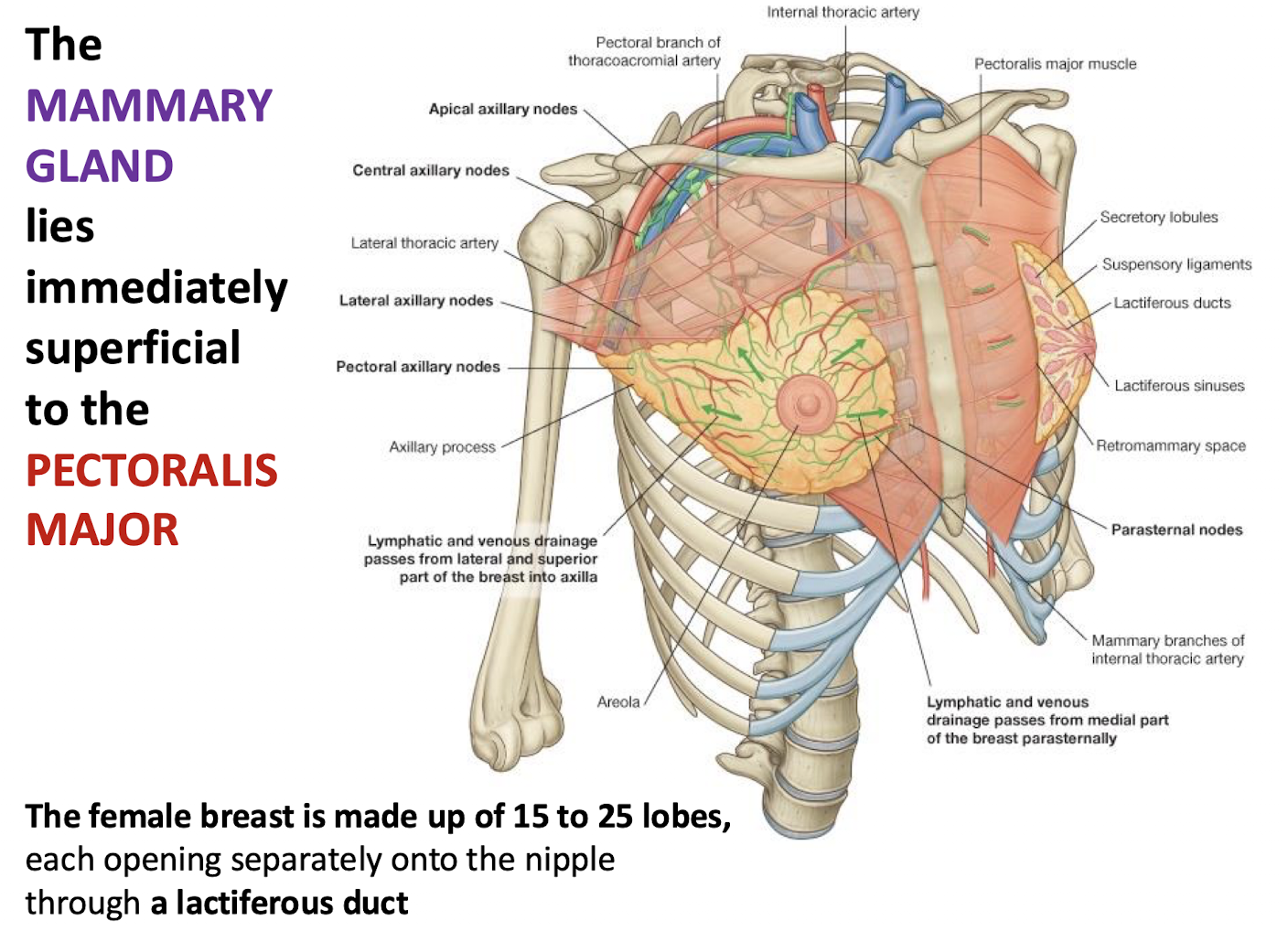Location: The mammary gland lies immediately superficial to the pectoralis major muscle.