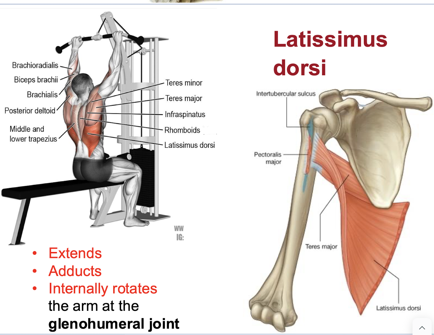 It extends, adducts, and internally rotates the arm AT THE GLENOHUMERAL JOINT.