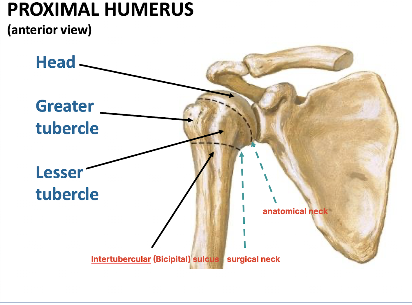 The head, anatomical neck, surgical neck, Intertubercular (Bicipital) sulcus, greater tubercle, and lesser tubercle.