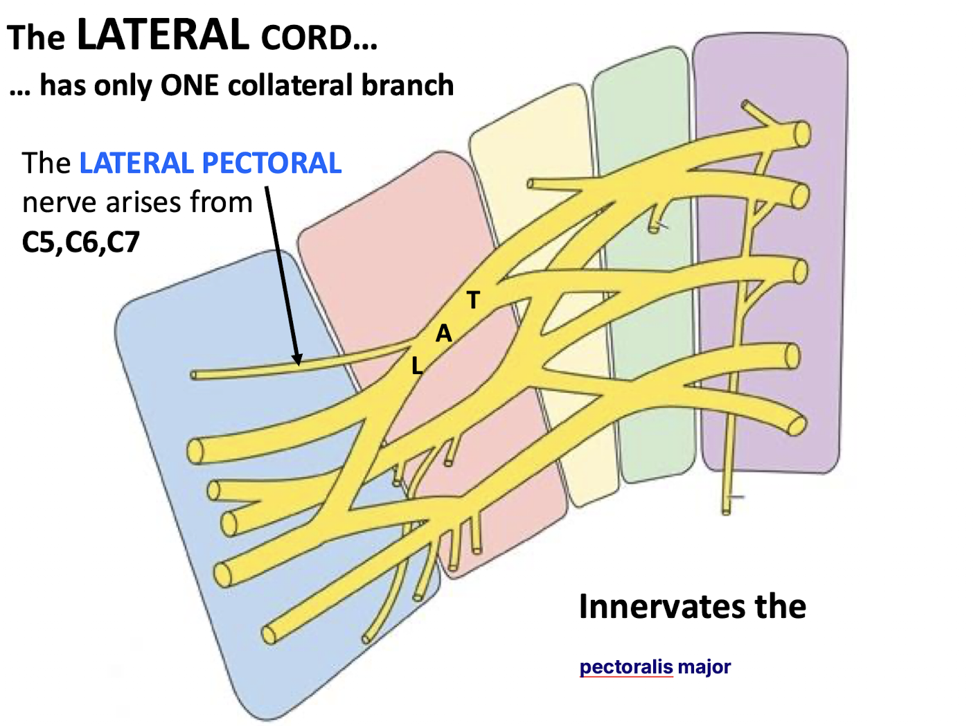The lateral pectoral nerve (C5-C7). Innervates the pectoralis major