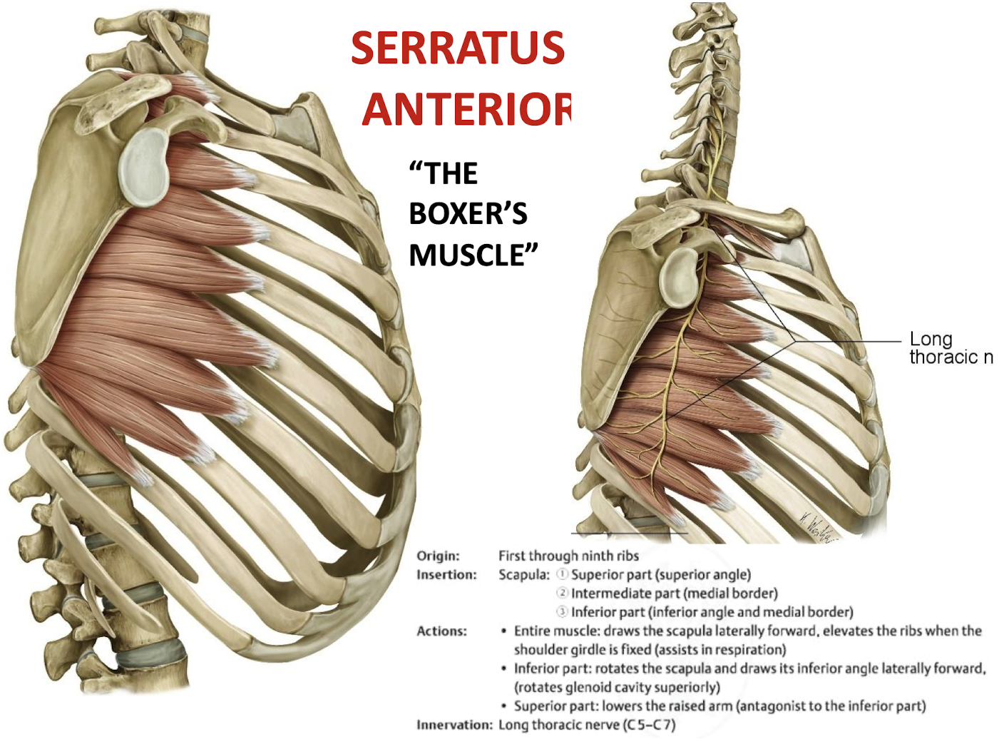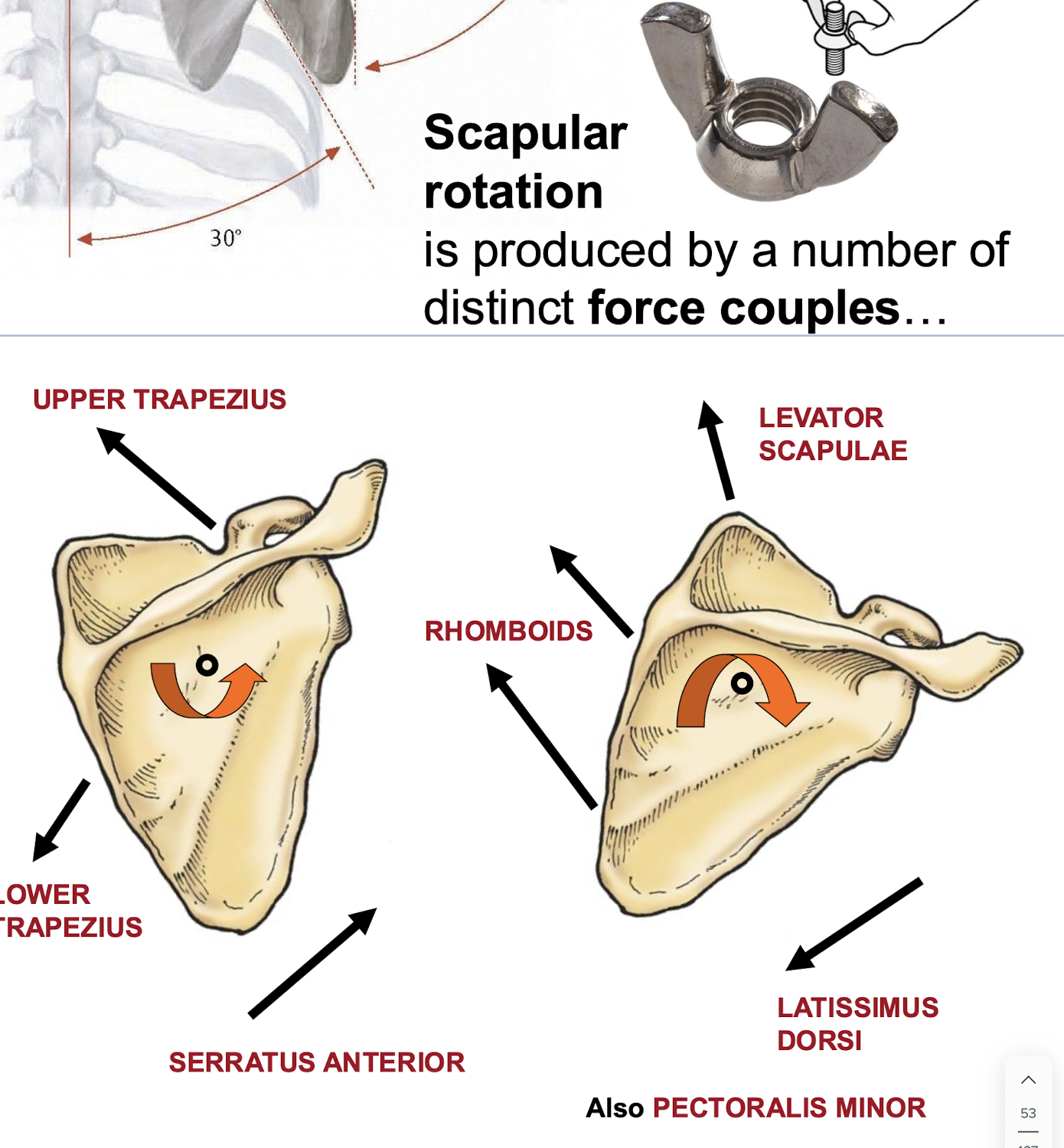 Upper/lower trapezius, serratus anterior, levator scapulae, rhomboids, pectoralis minor, and latissimus dorsi.