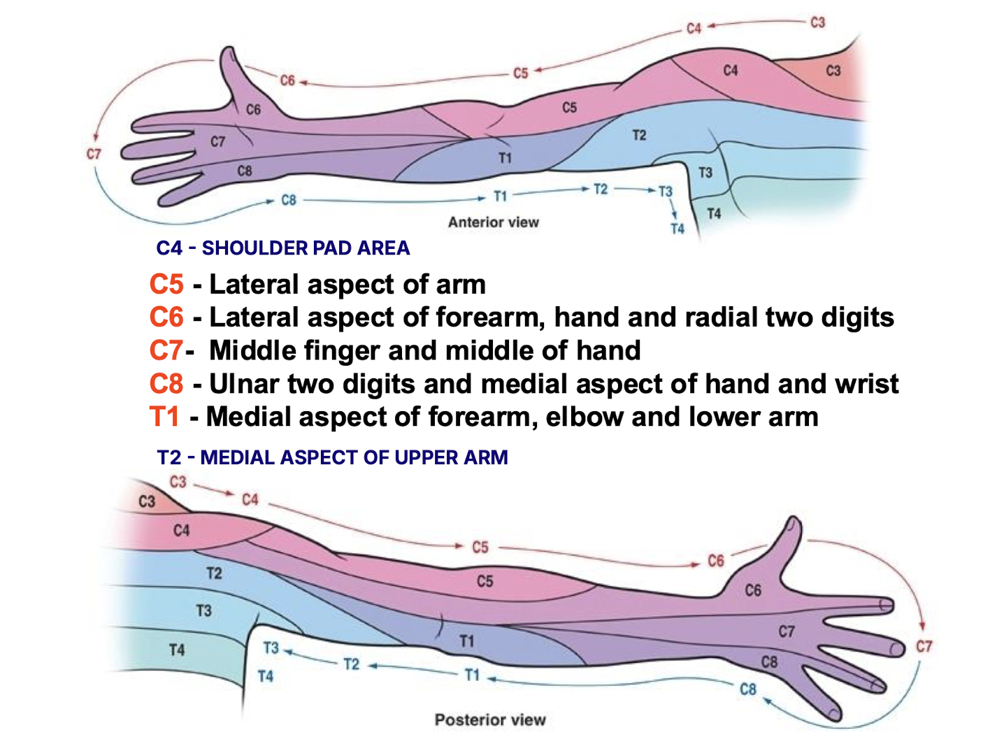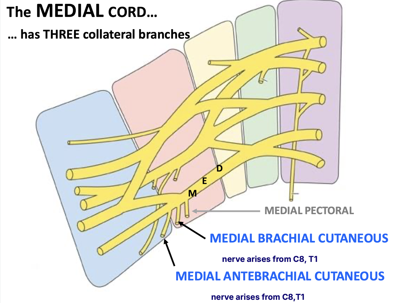 Medial Antebrachial Cutaneous Nerve (C8–T1) – sensory to medial forearm.