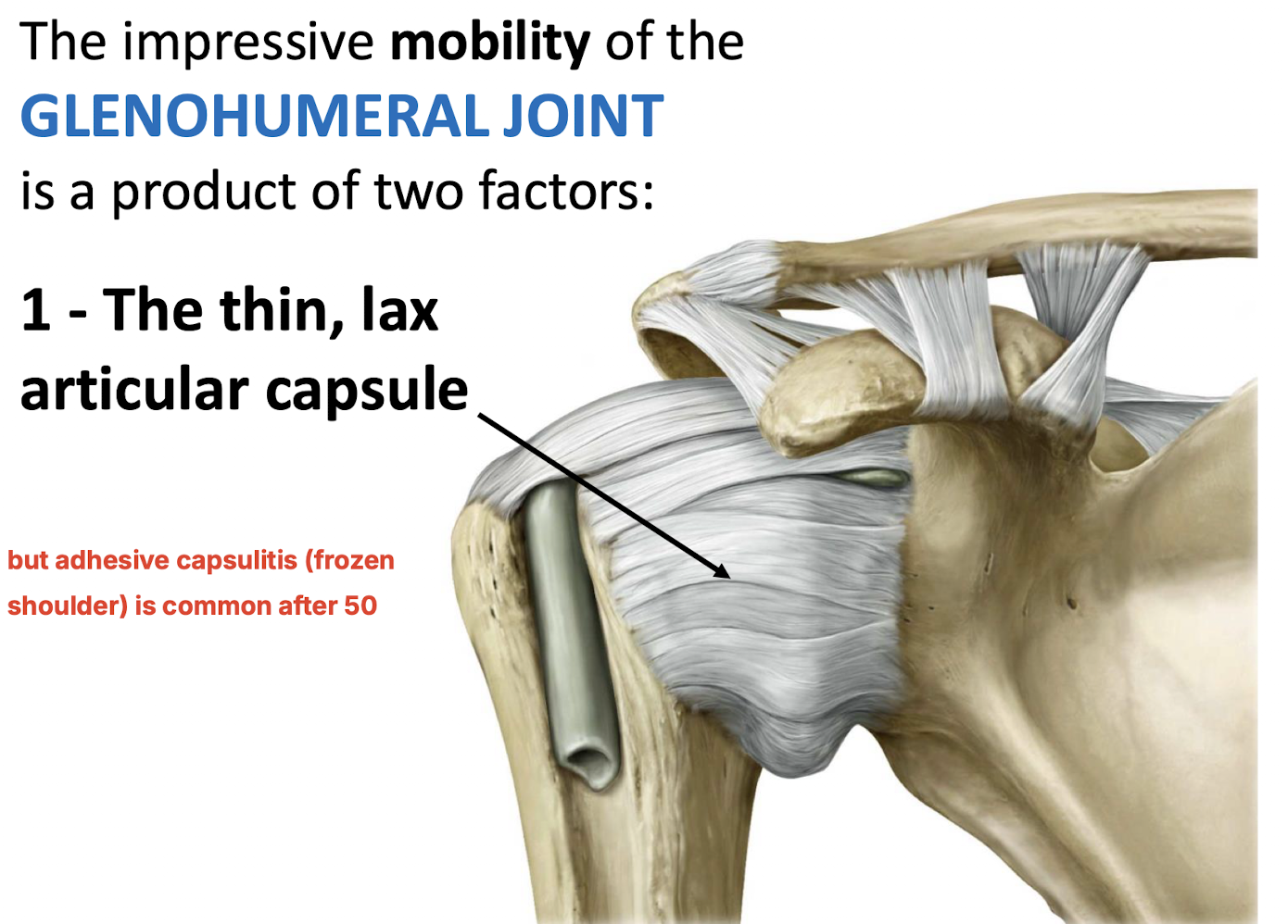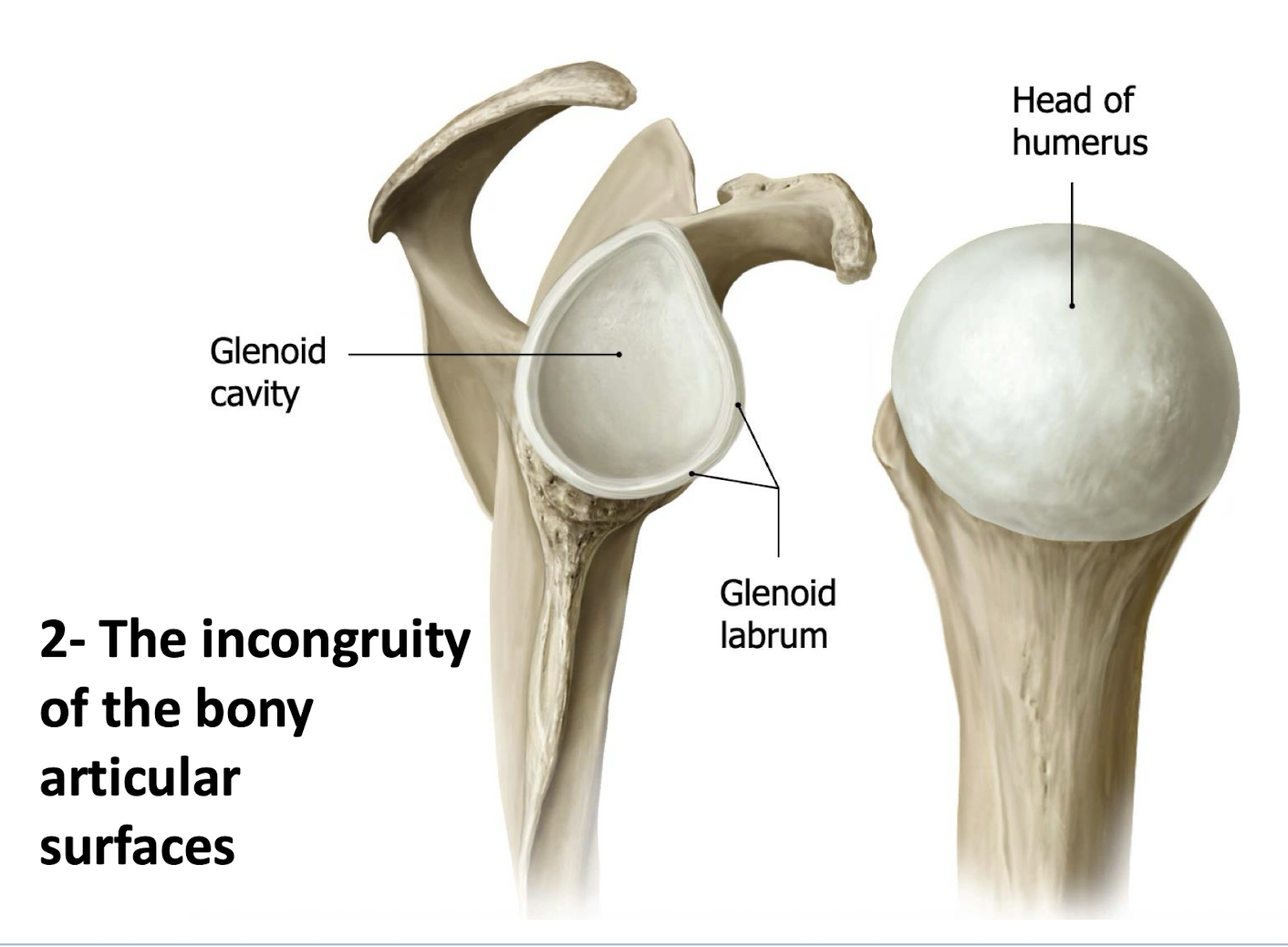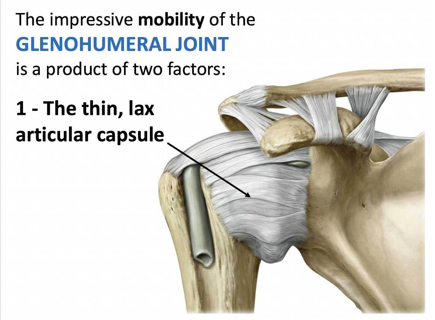 The thin, lax articular capsule and the incongruity of the bony articular surfaces.