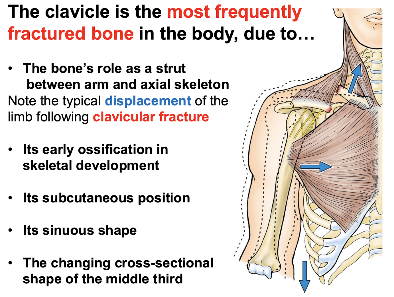 List five reasons why the clavicle is the most frequently fractured bone in the body.