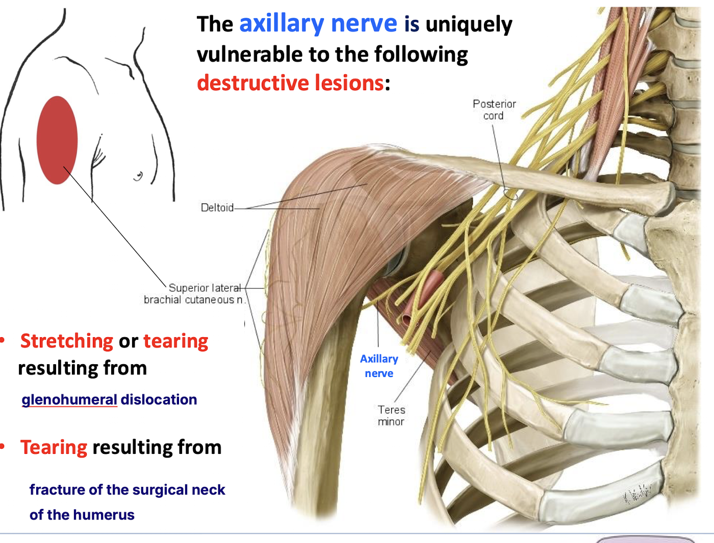 At the surgical neck of the humerus (tearing) and during glenohumeral dislocation (stretching/tearing).
