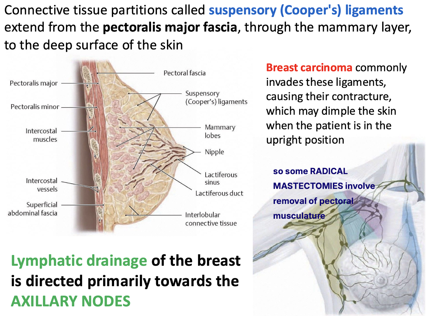 Breast carcinoma often invades these ligaments, causing contracture and skin dimpling (especially upright).
