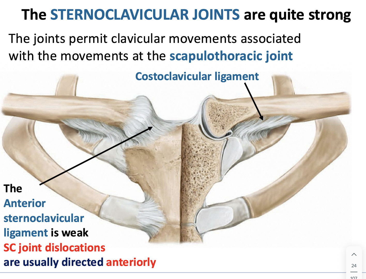 The anterior sternoclavicular ligament. SC joint locations are thus usually directed ANTERIORLY
