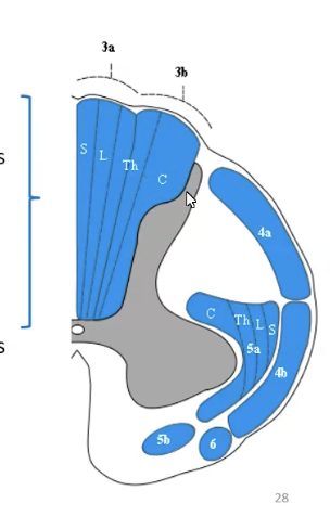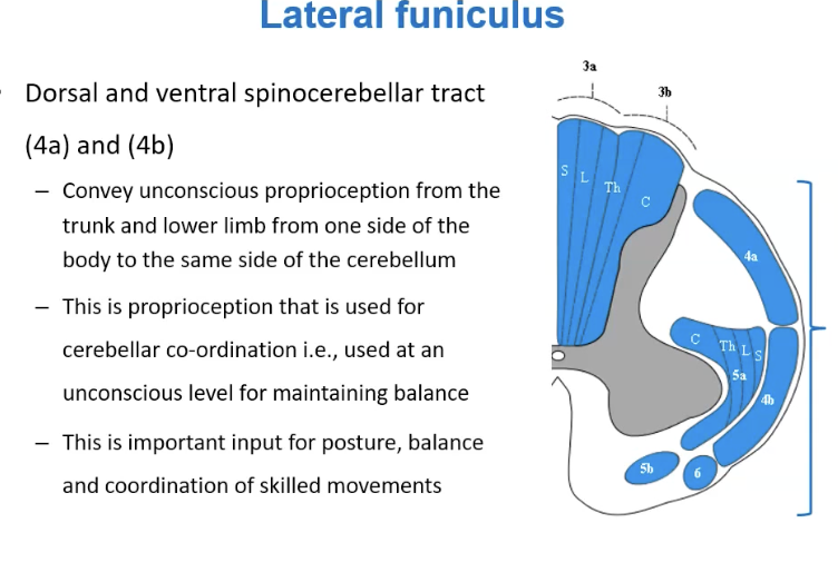 Unconscious proprioceptive information (first order neurons are usually golgi tendons) enters through the dorsal grey horn onto second order neurons.