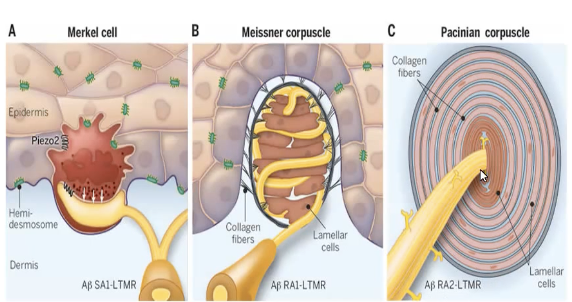 Meissner, ruffini, and pacinian corpuscles (Aβ) are encapsulated by cells or connective tissue to detect light pressure or vibration.