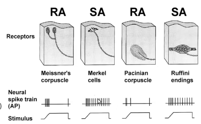 Meissner’s corpuscle responds instantaneously to change but stop firing after the stimulus has been there a while (fast adaption rate)