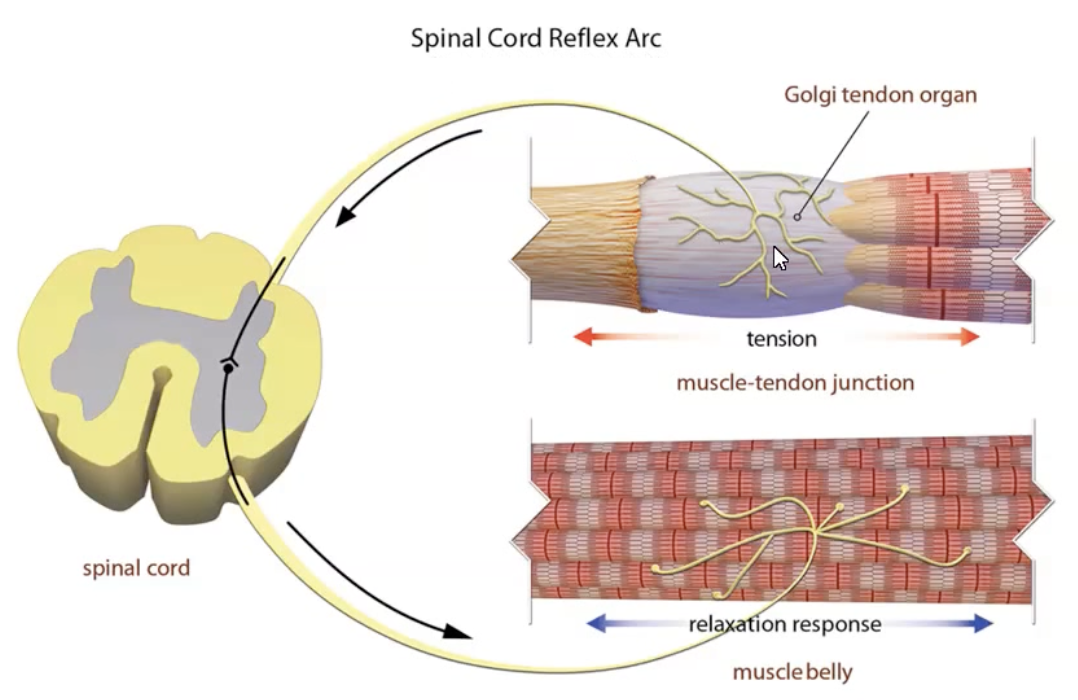 Sensory afferents (1b) detect tension and convey AP’s to inhibit alpha motor efferents causing the muscle to relax