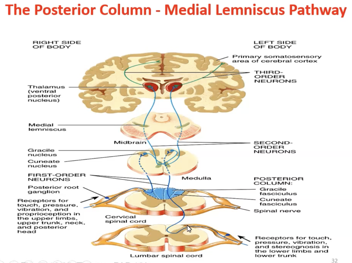 Second order neurons decussate and enter the medial lemniscus from the medulla to the VPL in the thalamus.