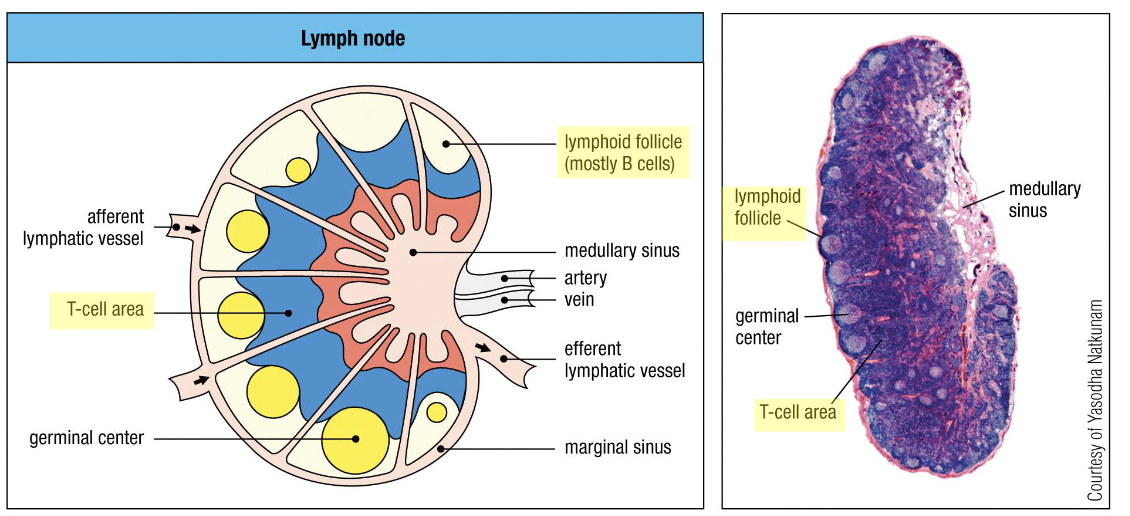 Lymph node collects fluid from tissues → brings antigens to lymphocytes