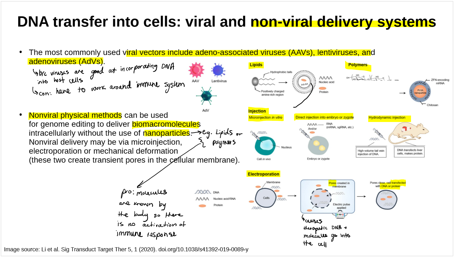 ex vivo (outside the body; cell therapy): removing cells from a patient, modifying them in a culture, reintroducing cells into the patient