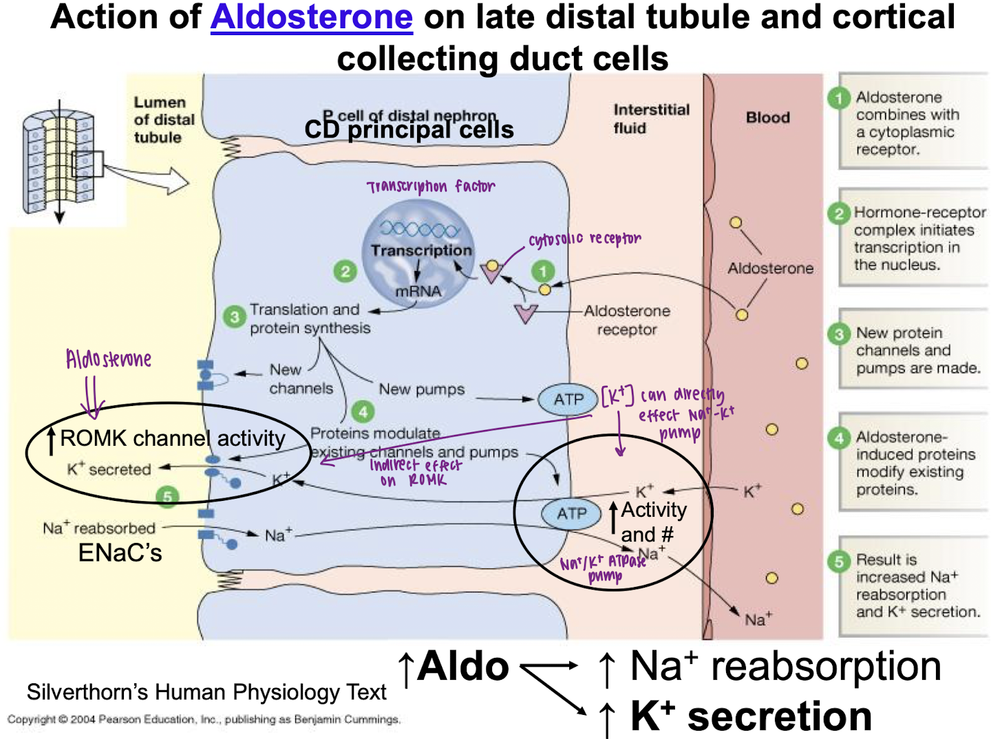 Aldo stimulates Na+ reabsorption in connecting tubule and CCD (via ENaC and Na/K ATPases) → high Na+ and H2O retention