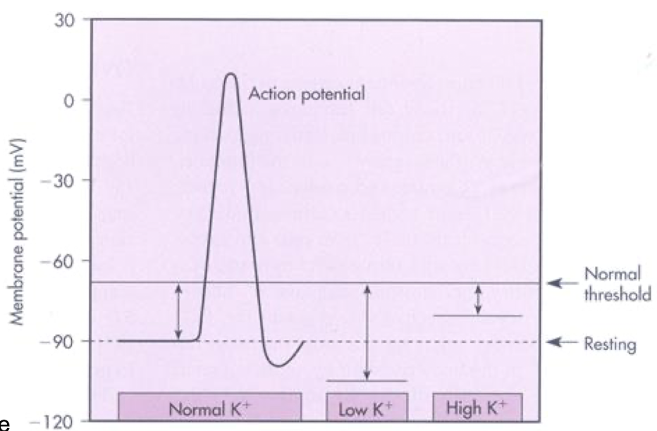 bigger K+ gradient → more negative equilibrium potential for K+ (Ek) → pulls the resting potential toward K+ equilibrium potential → Vm farther from threshold → more difficult to generate action potential