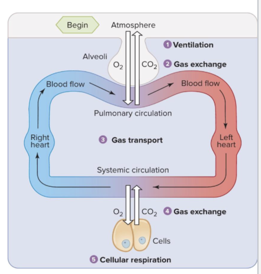 transport of O2 and CO2 thru pulmonary and systemic circulation
