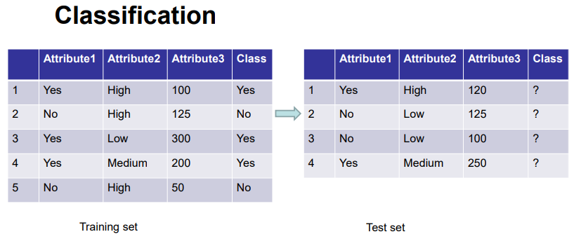 Task: learn a model that maps each attribute set x into one of the predefined class labels y