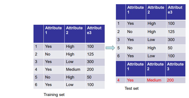 Each record is by characterized by a tuple (x,y), where x is the attribute set and y is the class label