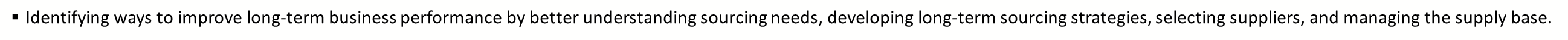 Identifying ways to improve long-term business performance by better understanding sourcing needs, developing long-term sourcing strategies, selecting suppliers, and managing the supply base.