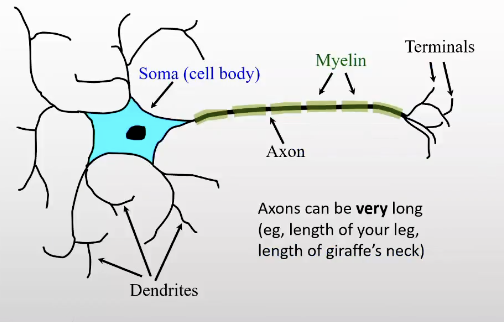 length of the axon varies between neurons — can be very long, varies a lot in length