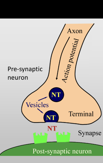 calcium ions also entered during action potential which triggers NT vesicles — causes them to move from inside to fuse onto the wall of the membrane and spill the NT content out into synapse