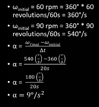 You are conducting a cycling study where a subject is rotation the cycle flywheel at 60 revolutions per minute (rpm) and he accelerates 90 rpm over the course of 20 seconds . What is the average angular acceleration
