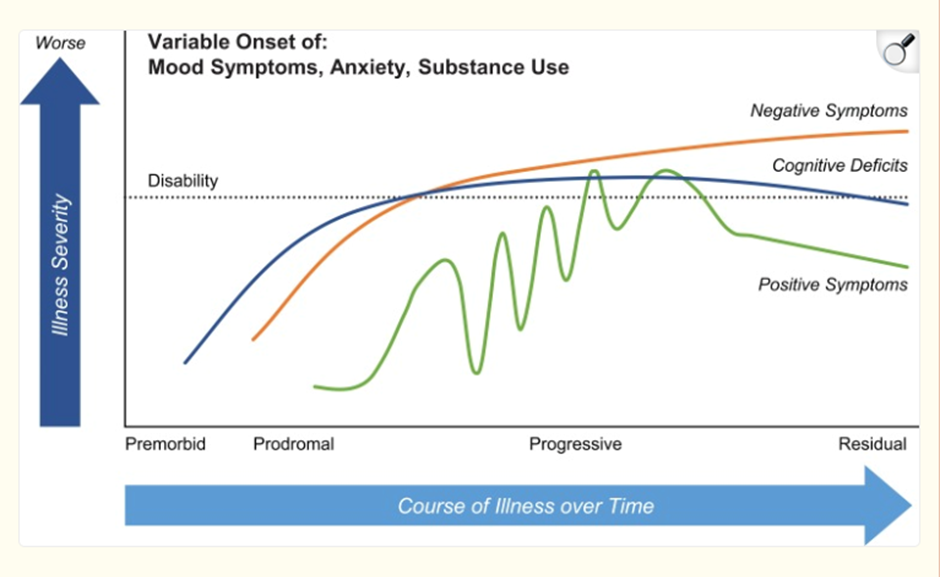 Symptoms are separated into positive and negative symptoms, usually with the onset of positive symptoms first