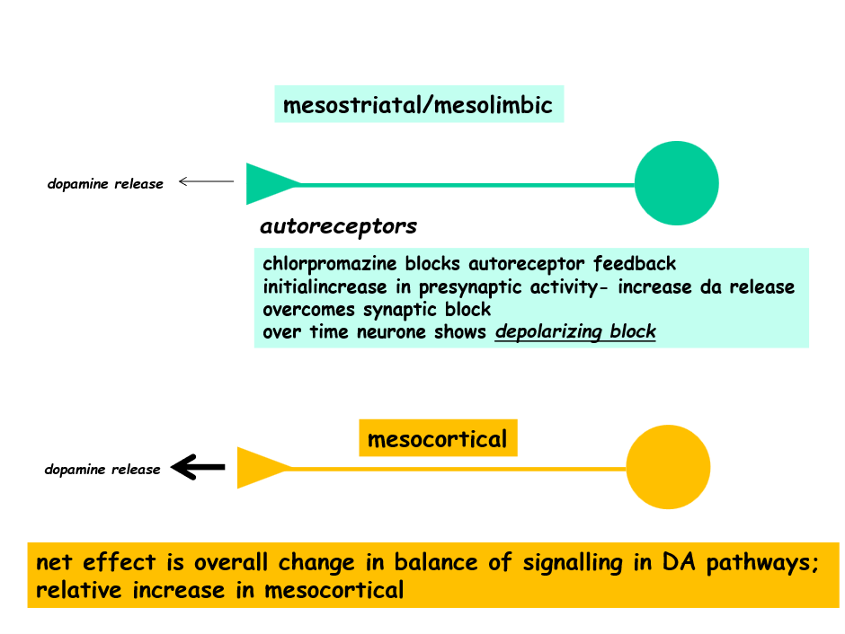 Due to more dense D2 receptor populations in the Nacc and baseline activity of receptors differing, chlorpromazine has a greater affect on the mesolimbic pathway
