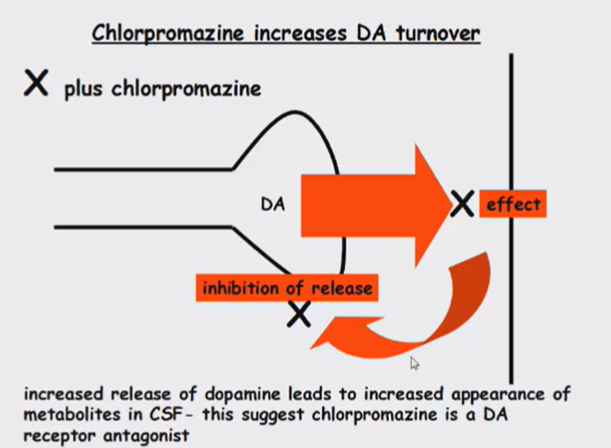 Chlorpromazines primary mechanism of action is binding antagonistically to the D2 receptors on the post synaptic nerve terminal, however, it also antagonistically binds to autoreceptors on the presynaptic nerve terminal.