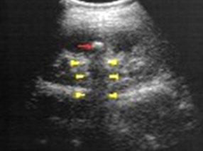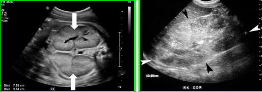 Enlarged hyperechoic kidneys. May see hepatic fibrosis and splenomegaly in severe cases (with prolonged survival).