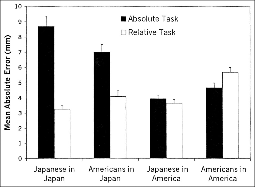 JPN better at relative task than absolute and vice versa