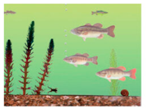 ‘Some fish were swimming near the ocean floor towards the seaweed. in the back other smaller fish swam away from it’