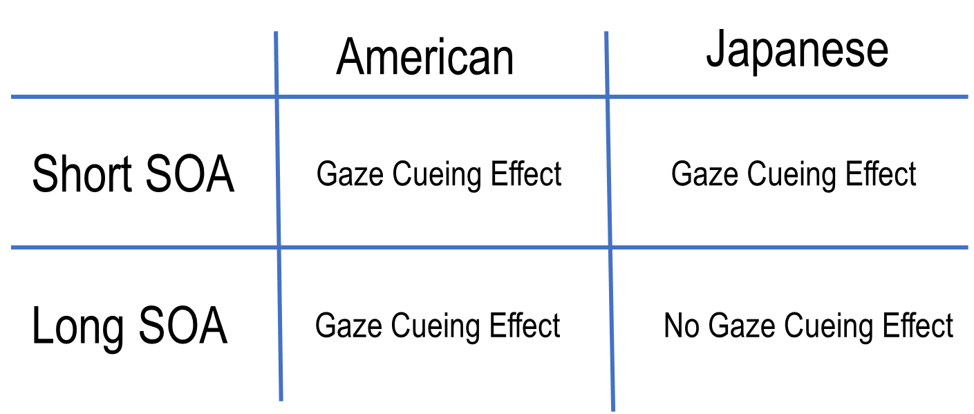 At longer SOA’s Japanese ppts are better at using contextual info and disengage from the irrelevant gaze