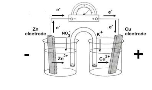 salt bridge: completes the circuit by preventing the build-up of charge by allowing ions to flow from one solution to another.