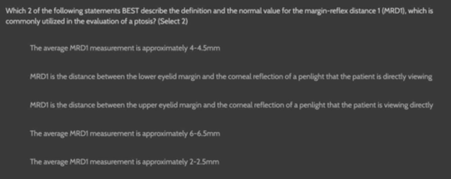 MRD1 is the distance between the upper eyelid margin and the corneal reflection of a penlight that the patient is viewing directly