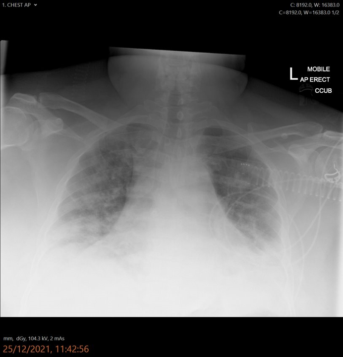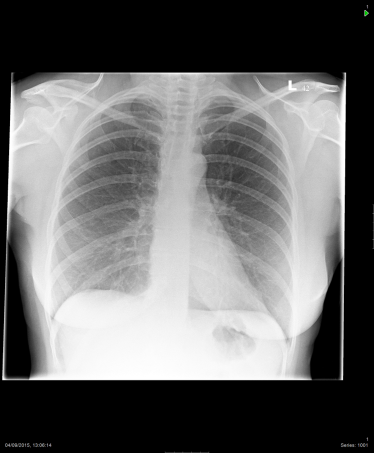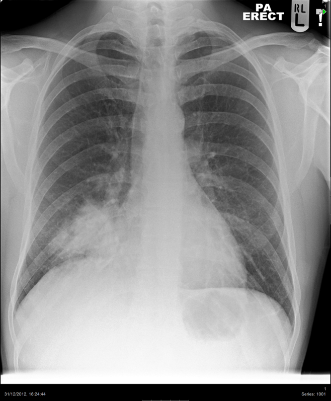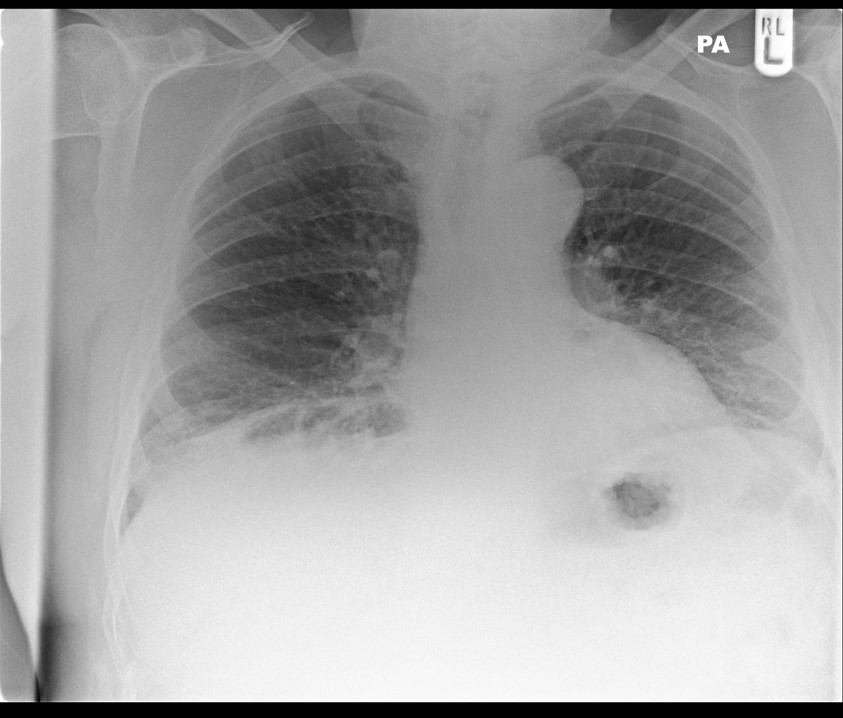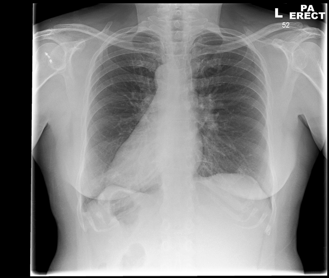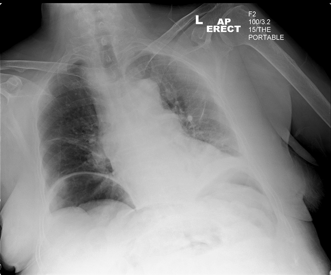 Red herring: air under diaphragm is due to poor inspiratory effort with small bowel visible under diaphragm