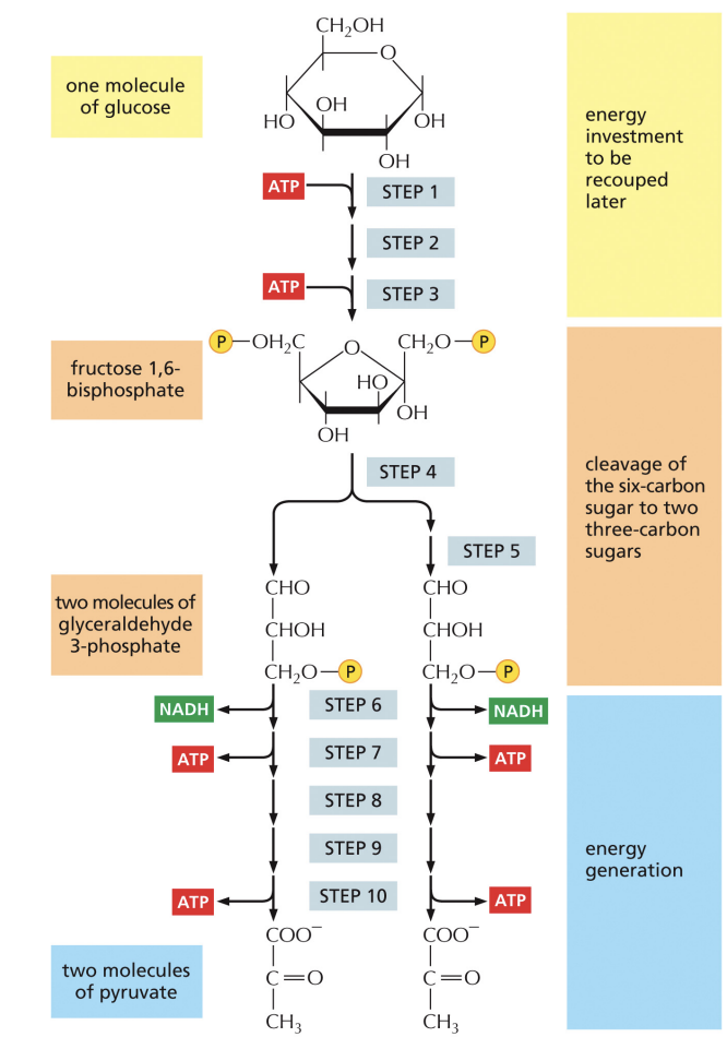 Glucose —> • Fructose 1,6 bisphosphate —> glyceraldehyde 3-phosphate (G3P) —> broken into 2 molecules of pyruvate + 4 ATP + 2 NADH.