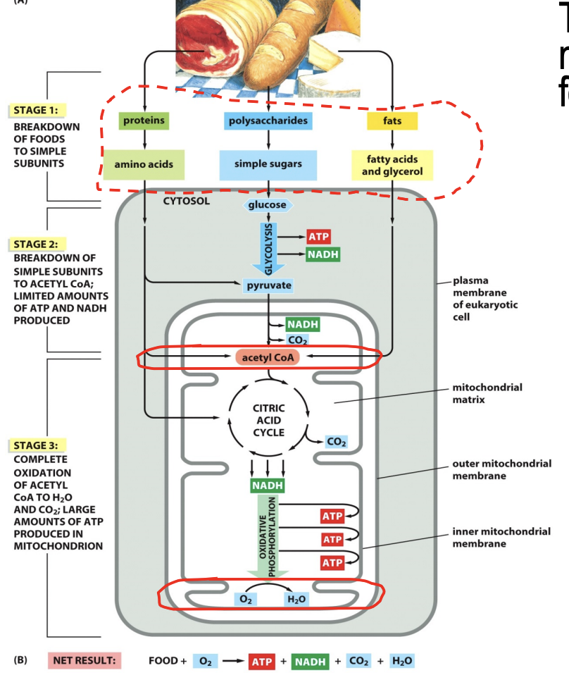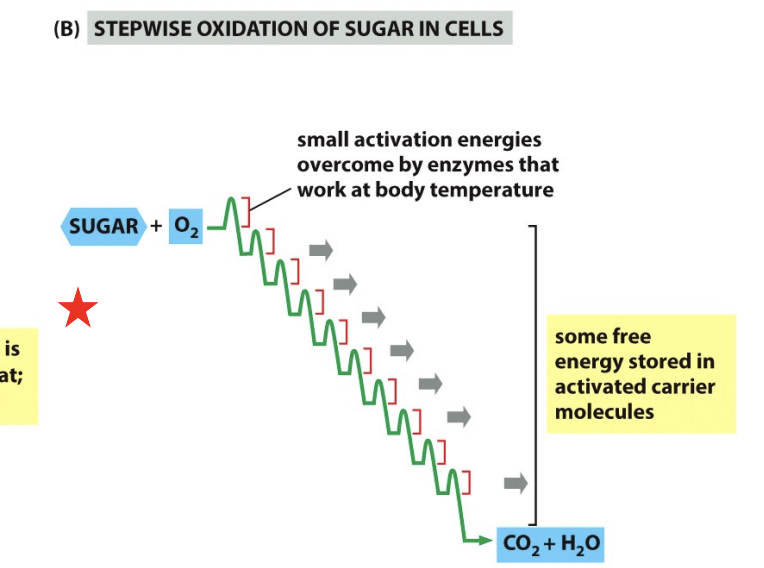 the ezyme catalzes the oxidation of sugar and hte free energy is transferred ot carrier molecules; ATP and NADH