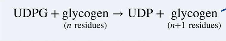 It transfers glucosyl unit of UDPG to C4-OH group on one of glycogen’s non-reducing ends to form an α(1→4) glycosidic bond