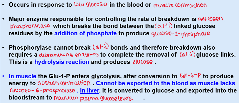 Glycogen is degraded between meals in the liver by the glycogenolysis pathway to produce glucose-1-phosphate which can be converted to free glucose and exported into the bloodstream to maintain plasma glucose levels. It can also be broken down in muscle to provide the energy to support muscle contraction.